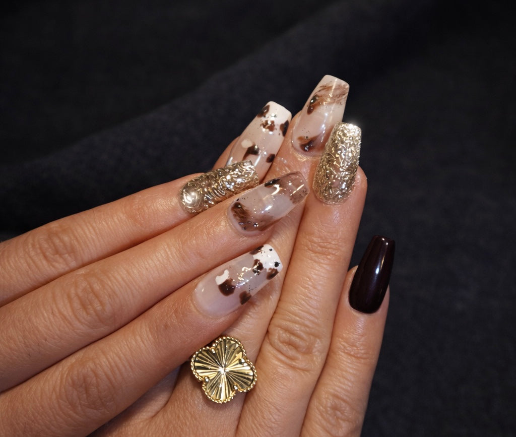Laissez-vous séduire par Golden Mocha, une pose sophistiquée aux nuances nude, chocolat et doré. Ce design unique mêle effets marbrés, touches artistiques et paillettes lumineuses pour un rendu à la fois chic et moderne.